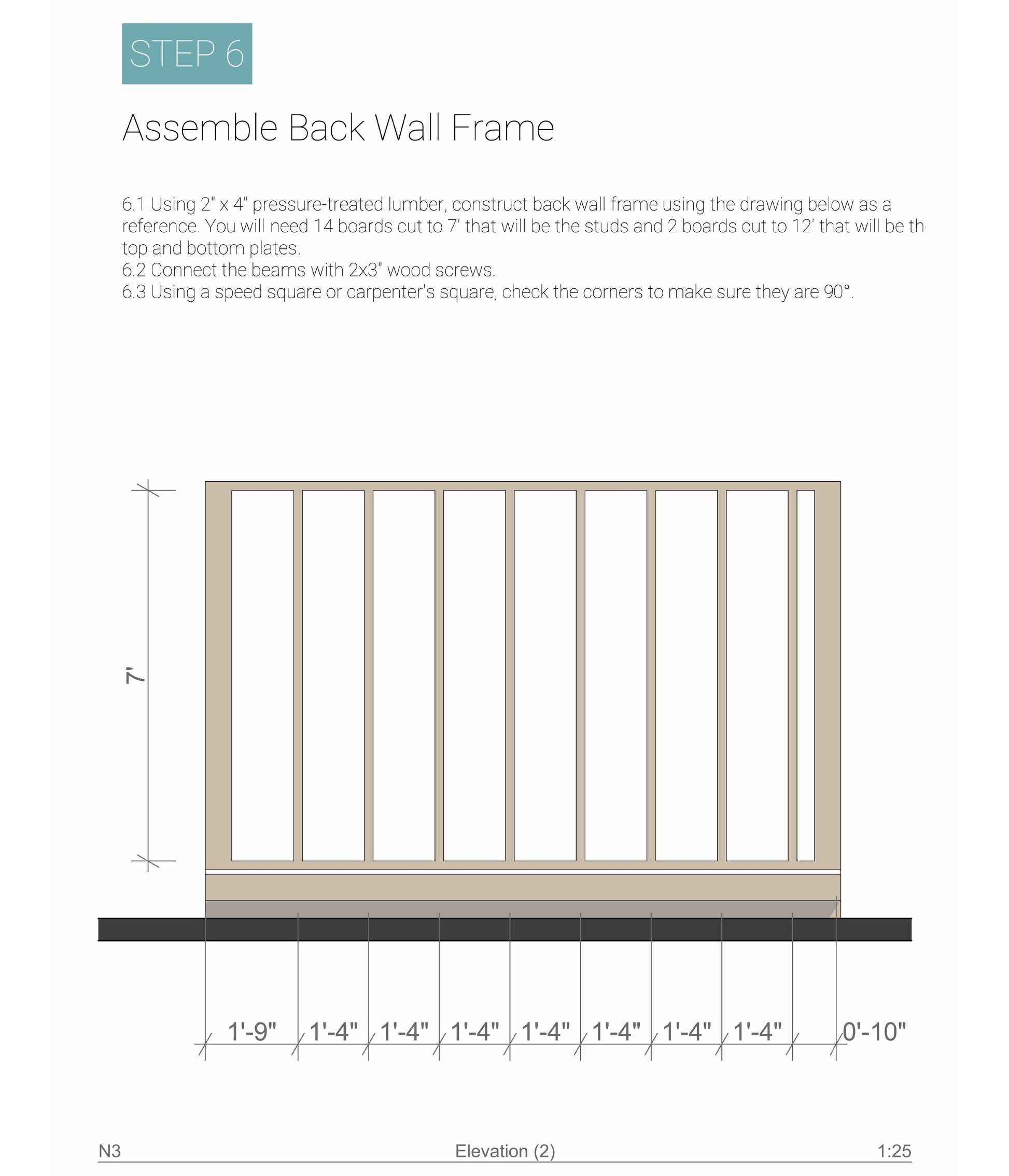 - Framing Elevations: Clear diagrams for framing the shed