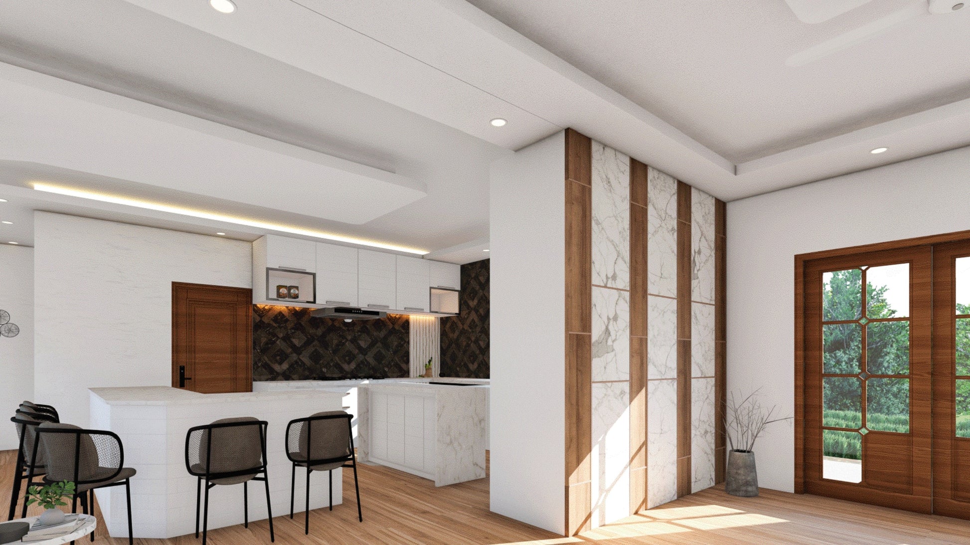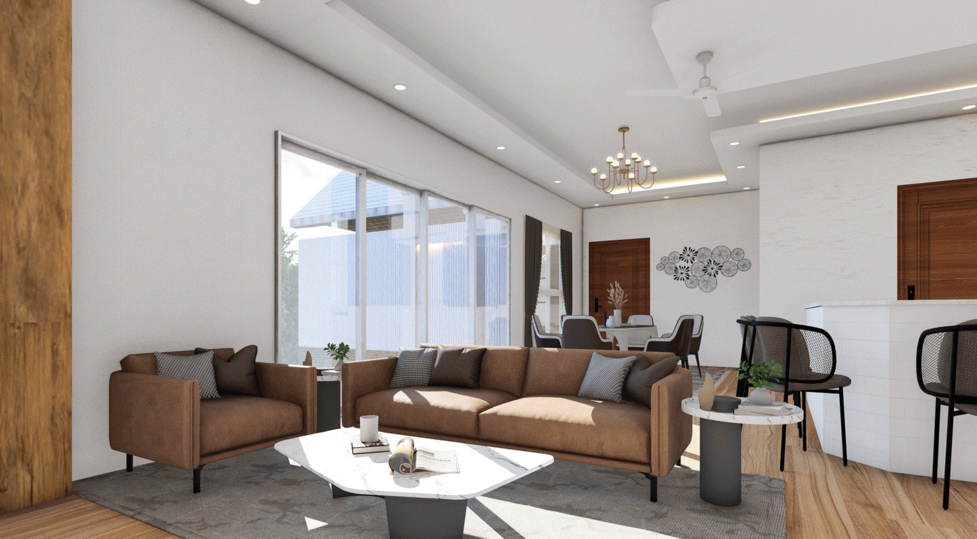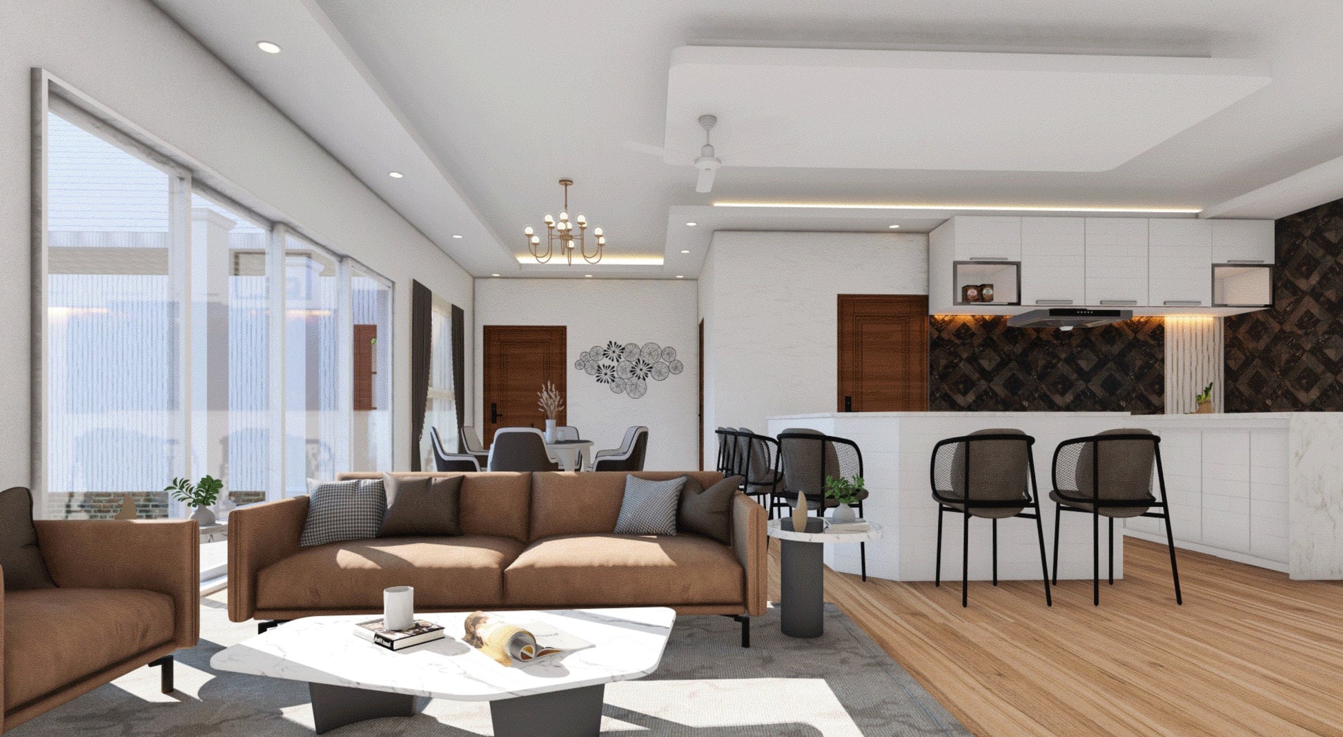 - Living Areas: Kitchen, dining room, and living space