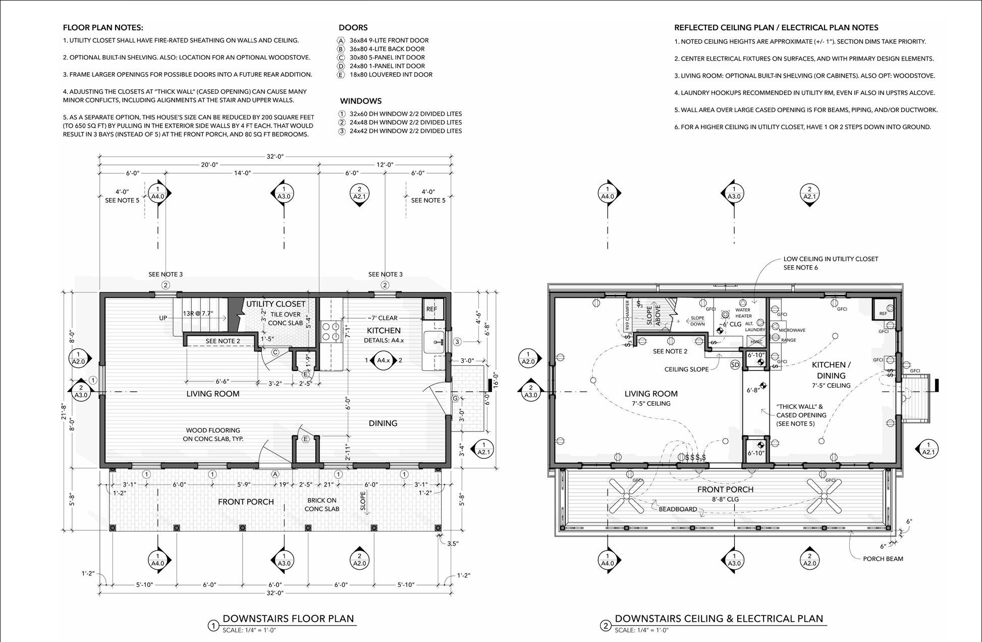 - Includes foundation, roof, floor, electrical plans, elevations, and sections